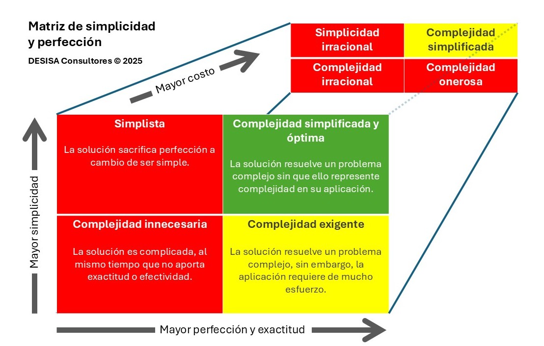 Naturalmente, al momento de embarcarse en una tarea, proyecto o iniciativa organizacional, toda persona debe buscar una solución simple que logre perfección o exactitud en sus resultados y al menor costo posible (Complejidad Simplificada y Óptima ⇒ cuadrante verde). Sin embargo, podría ser también aceptable una solución simple y de alto impacto a un costo mayor (Complejidad Simplificada ⇒ cuadrante superior derecho de la matriz de alto costo). Por último, a nuestro criterio, es también una alternativa una solución de bajo costo y alto impacto, aunque no necesariamente sea muy simple de implementar (Complejidad Exigente ⇒ cuadrante inferior derecho de la matriz de bajo costo), la cual representa la opción del “sacrificio en esfuerzo a cambio de poca inversión”.